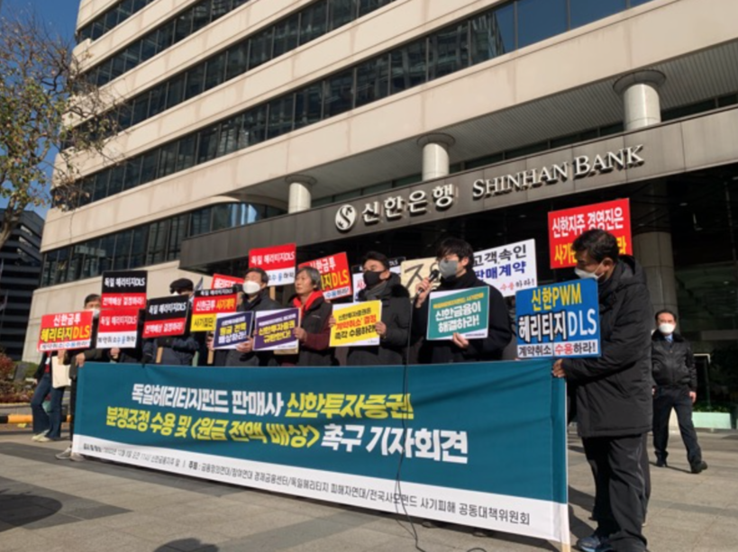 한편 금융정의연대는 지난 8일 신한금융지주 앞에서 독일헤리티지펀드 판매사 신한투자증권 ‘분쟁조정 수용 및 원금 전액 배상’ 촉구 기자회견을 열고 “신한투자증권은 금감원의 ‘계약취소’ 결정을 즉각 수용하라!”고 촉구했다.