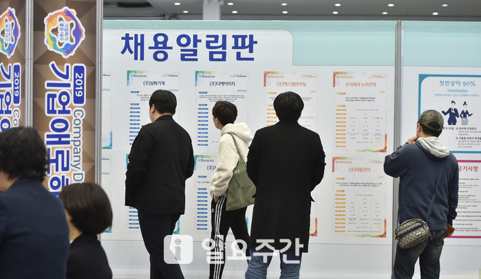 ▲현장채용박람회에서 청년 구직자들이 채용알림판을 보고 있는 모습. |