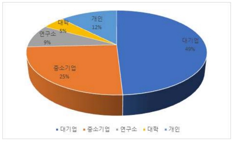 세부 출원인별로는 내국인이 전체 건수의 89.2%(267건), 외국인 10.8%(32건)였다. 현대자동차(46건), LG전자(7건), 한국과학기술원(12건) 등 대기업과 연구소가 58%(178건)로서 출원을 주도했다. 에드원(8건)과 그린파워(6건) 등 중소기업의 비중은 25%(77건)였다.