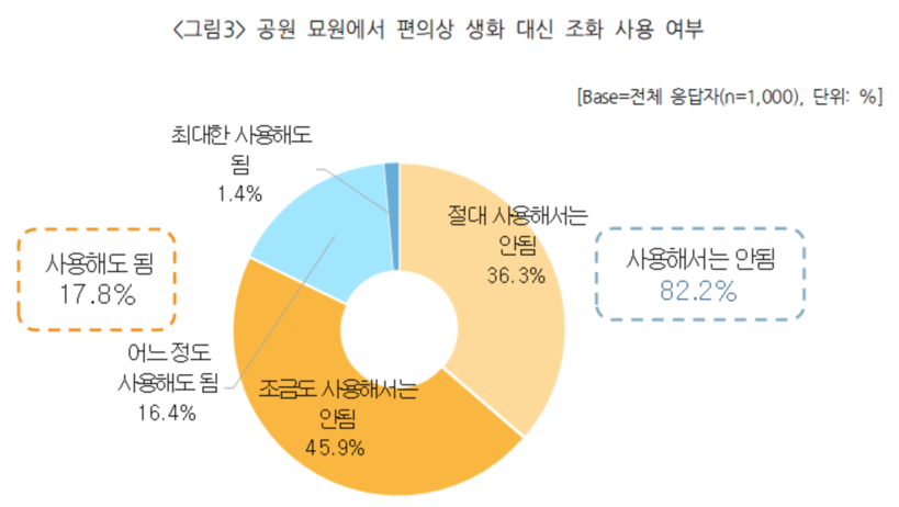 이에 대해 국립 및 민간 묘원의 관리 편의성을 위해 생화보다 조화를 사용해야 한다는 의견에 대해 82.2%의 대다수 소비자는 조화를 사용해서는 안 된다는 의견을 밝혔고, 예산이 좀 더 들어가더라도 국립 및 민간 묘원에서 조화보다 생화를 사용해야 한다는 의견에 대해서는 81.2%의 소비자가 찬성하는 것으로 나타났다.