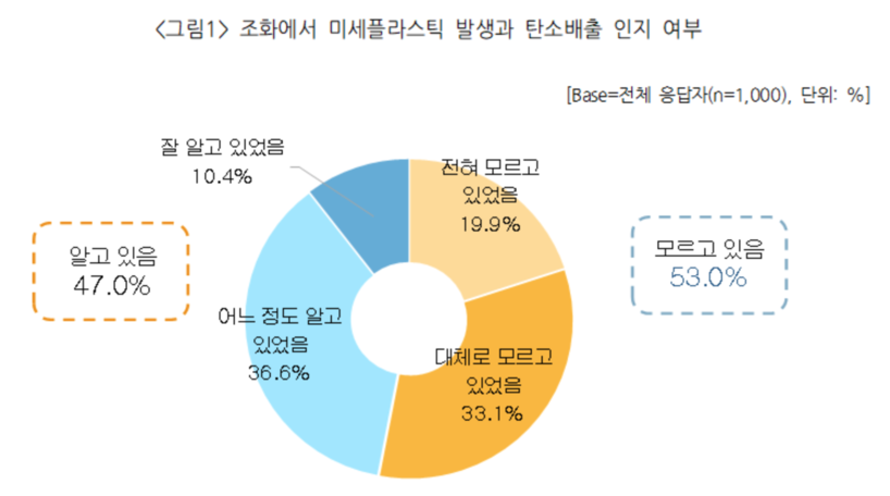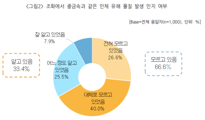 우선 소비자들은 조화의 사용으로 미세플라스틱 발생과 탄소배출이 일어난다는 사실에 대해 53.0%는 이를 인지하지 못하고 있는 것으로 나타났고, 조화에서 중금속과 같은 인체 유해물질이 발생하고 있는지에 대해서도 66.6%의 소비자는 모르고 있는 것으로 조사됐다.
