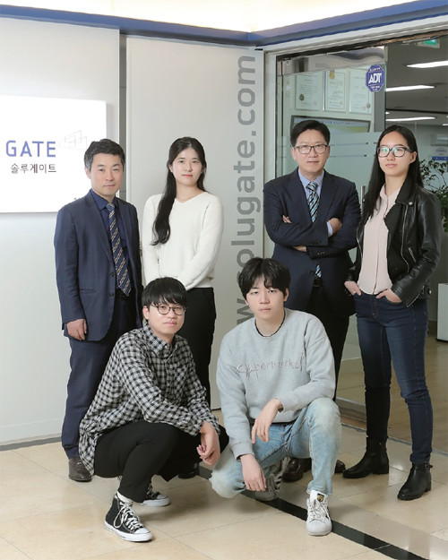 | ▲ 민성태 솔루게이트 대표(오른쪽 두번째)와 직원들이 기념촬영을 하고 있다.(사진=솔루게이트 제공) |