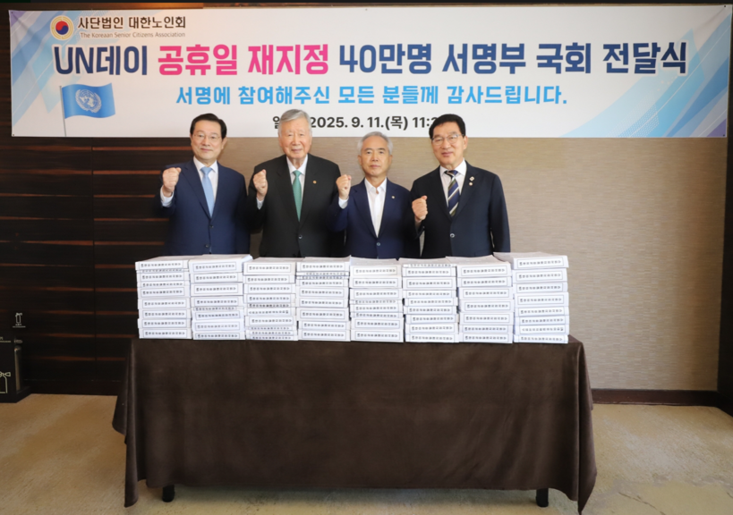 [일요주간 = 김성환 기자] 저출생·고령화 해법으로 출산장려금 1억 원 지급과 노인 연령 상향을 제안한 이중근 대한노인회장(부영그룹 회장)이 지난 11일 40만 명 서명이 담긴 ‘유엔데이 공휴일 재지정’ 서명부를 국회에 전달하며, 6·25전쟁 당시 유엔군 60개국의 희생과 헌신을 기리고 외교·역사적 의미를 되살리기 위한 국가 공휴일 복원을 요청했다.
