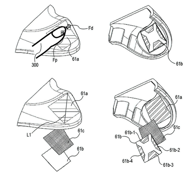 특허 자료에서 볼 수 있듯이, 일반적으로 셔터 버튼이 없고 밋밋한 영역으로 처리되어 있다. 이 영역은 터치패드 형태로, 카메라로 수행 중인 설정 또는 메뉴에 따라 여러 작업을 수행하는 데 사용할 수 있는 것으로 추측된다.