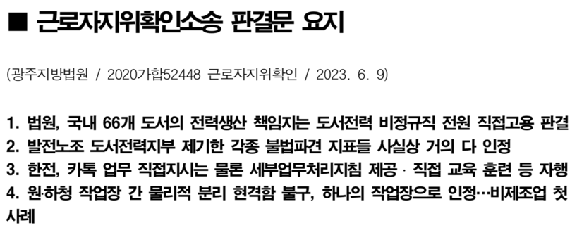 앞서 광주지방법원은 근로자지위확인 소송과 관련해 2023년 6월 9일 국내 66개 도서의 전력생산을 책임지는 도서전력 비정규직 전원을 한국전력이 직접 고용해야 한다고 판결한 바 있다. 발전노조 도서전력지부가 제기한 다수의 불법파견 지표를 사실상 모두 인정했다.