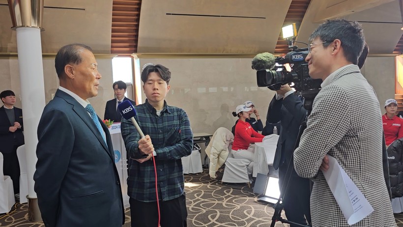 ▲ 대보그룹 최등규 회장이 ‘2024 대보골프단 출범식’에서 한 방송과 인터뷰 중인 모습.(사진=대보그룹 제공) |