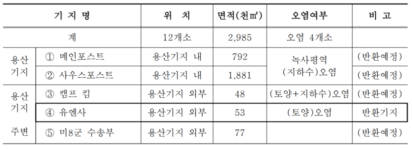앞서 유엔사 부지는 지난 2006년 반환되기 전 '석유계 총 탄화수소(TPH)' 오염물질이 검출돼 한국이 비용을 부담해 정화작업을 벌인 곳이다. 그런데도 2019년 부지 안 4곳에서 유류 오염물질인 '석유계 총 탄화수소'가 또다시 대량 검출되고 전체 조사 지점의 절반이 넘는 곳에서 식물 생육에 치명적 영향을 미치는 것으로 알려진 '불소'도 기준치 이상 검출된 바 있다.