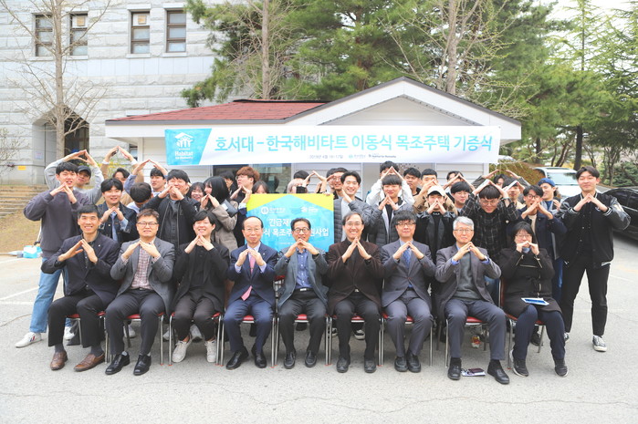 | ▲ 호서대학교가 한국건축학교육인증원이 주관하는 ‘건축학교육 프로그램 인증심사’에서 충청지역 사립대학 최초로 3회 연속 최고 등급으로 ‘6년 인증’을 획득했다고 28일 밝혔다. 사진은 한국해비타트 이동식 목조주택 기증식.(사진=호서대학교 제공) |