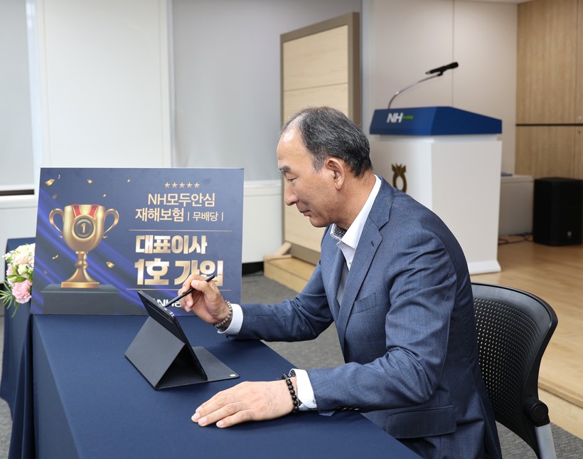 ▲ NH농협생명은 8월 4일(월) 신상품 3종을 출시한다고 밝혔다. 사진은 NH농협생명 대표이사가 NH모두안심재해보험(무)에 가입하는 모습.(사진=NH농협생명 제공) |