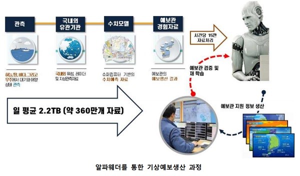 알파웨더는 차세대 AI 기술을 적용해 예보관의 예보생산과정을 학습한 후 시간당 100GB(약 15만개)의 데이터를 활용·분석, 예보관이 신속·정확한 예보정보를 생산할 수 있도록 지원하는 AI 프로그램이다.