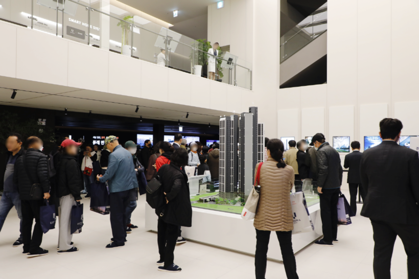 ▲ 지난 3월28일 오픈한 ‘동래반도유보라’모델하우스에서 방문객이 조형도를 관람하고 있다. (사진=반도건설 제공) |