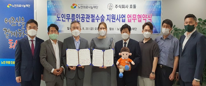 [일요주간 = 소정현 기자] 노인의료나눔재단(이사장 김성환)은 지난 8월 20일 오후1시, 서울 중구 재단사무실에서 노인 무릎인공관절수술 지원사업과 프리미엄AI케어서비스(가칭) 개발을 위하여 주식회사 효돌(대표 김지희)과 업무협약을 체결했다.