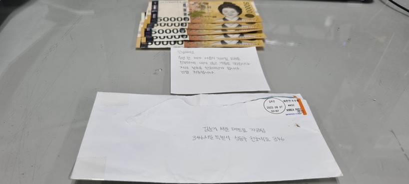 손으로 직접 쓴 편지의 내용은 “수년 전 서울시 지하철 요금을 정직하게 내지 않고 이용을 했으며, 잘못을 만회하고 싶고 정말 죄송합니다”라는 내용과 함께 현금 250,000원이 동봉되어 있었다.
