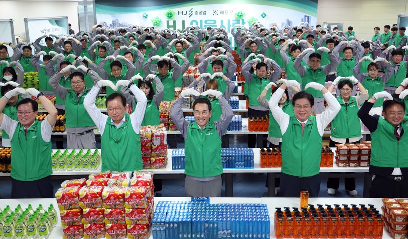 | ▲ HJ중공업 유상철 대표이사 등 임직원 200여 명이 12일 오전 부산 영도구 영도조선소 구내식당에서 저소득가정에 전달할 생필품 선물꾸러미를 포장하기에 앞서 하트 모양을 만들고 있다. (사진=HJ중공업 제공) |