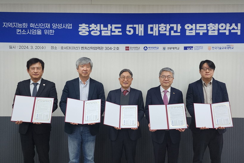 협약식은 호서대 서원교 산학협력단장, 백석대 한정수 산학협력단장, 선문대 이희원 산학협력단장, 순천향대 김용하 산학협력단장, 한기대 민준기 산학협력단장을 비롯한 관계자가 참석한 가운데 20일 호서대 아산캠퍼스 벤처산학협력관에서 진행됐다.