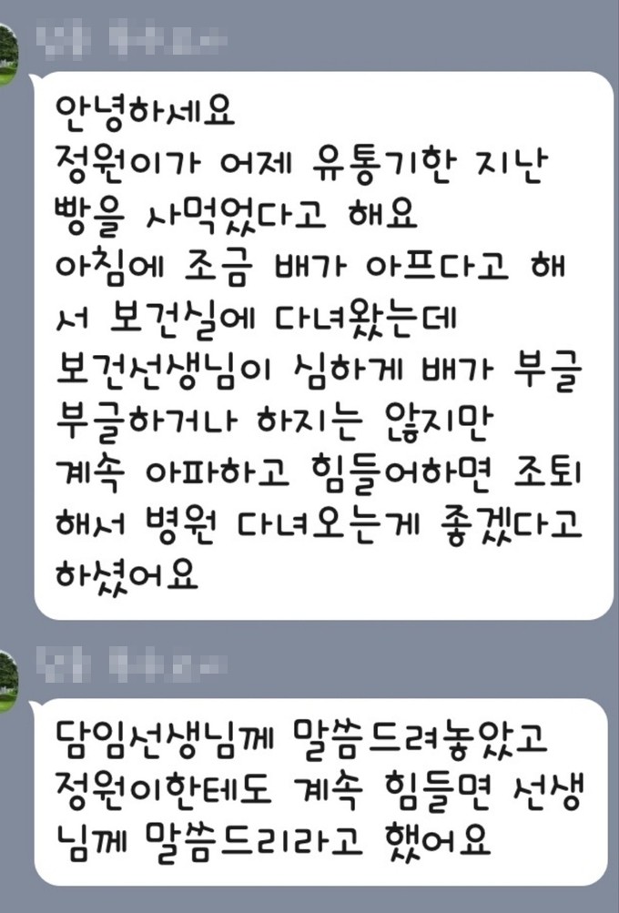 ▲A 씨의 초등학교 딸 아이가 유통기한이 지난 빵을 먹고 설사와 복통으로 아파서 학교를 못나가게 된 상황을 학교 선생님에게 설명하는 카카오톡 내용.(제보자 제공) |