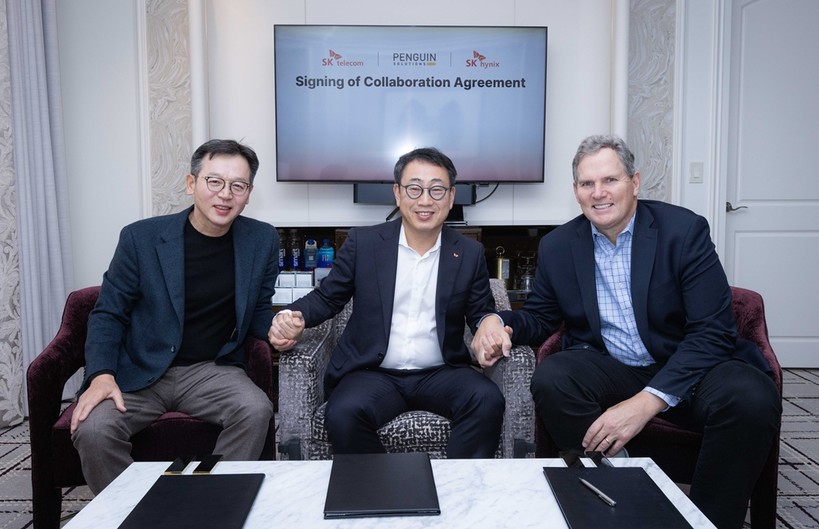 협약식은 유영상 SKT CEO, 김주선 SK하이닉스 AI Infra(인프라) 사장, 마크 아담스(Mark Adams) 펭귄 솔루션스 CEO 등 각 사 CEO 등이 참석한 가운데 9일 오전(현지시각) 미국 라스베이거스에서 진행됐다.