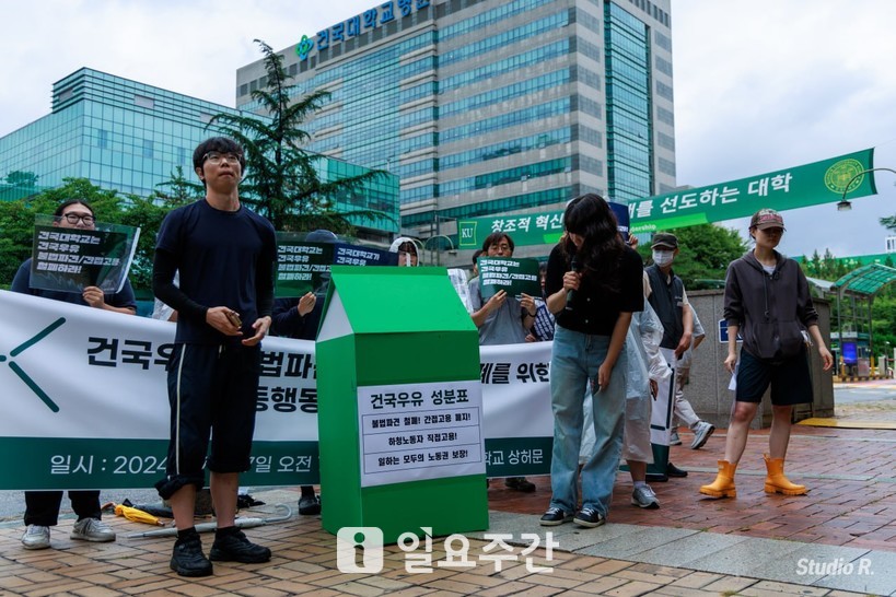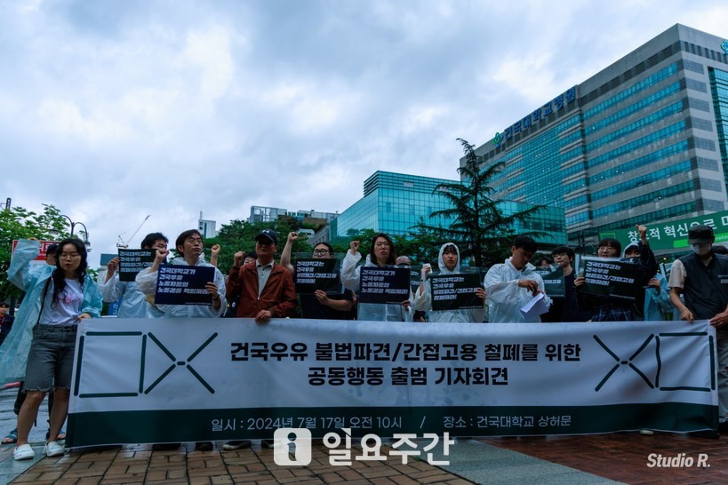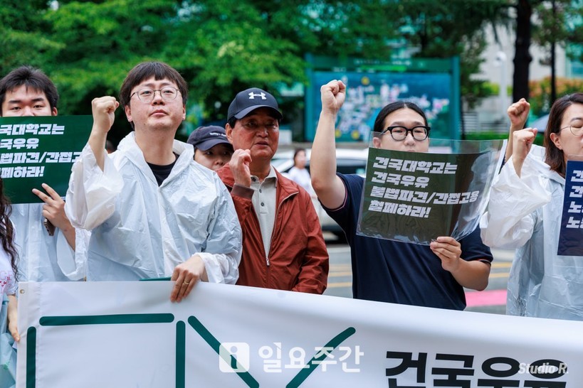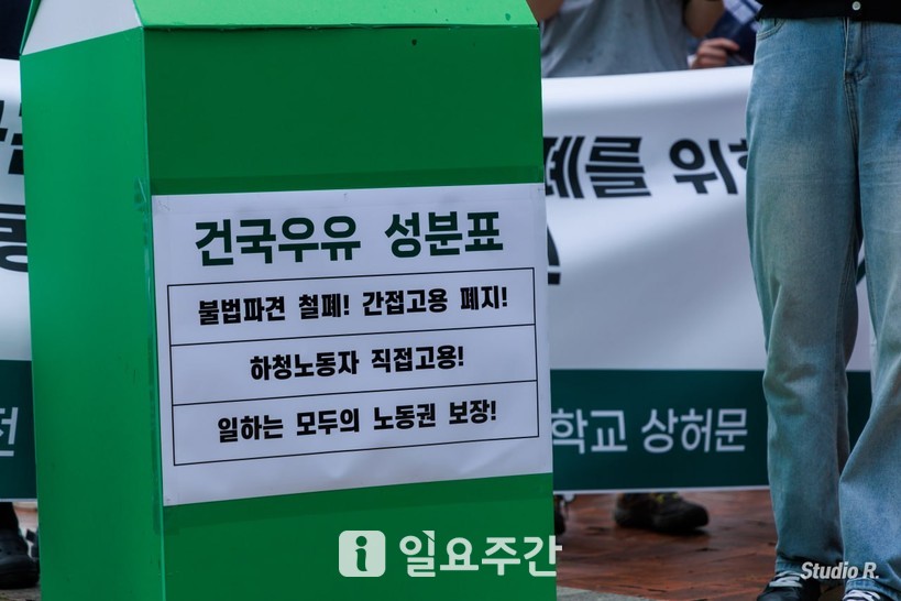 [일요주간 = 최부건 기자] “건국대학교는 건국우유의 불법파견·간접고용 철폐하라!”, “건국대학교가 건국우유 노동자들의 노동권을 책임져라!”