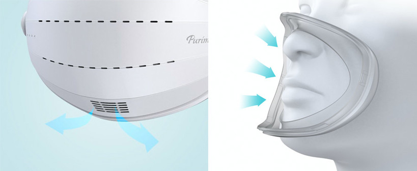 마스크 앞면에 LED 표시등을 이용해 팬 작동과 살균, 충전에 관한 정보를 체크할 수 있으며, 하단 홀을 통해 마스크 안의 이산화탄소를 배출시켜 안경에 김이 서리는 것을 막아준다.