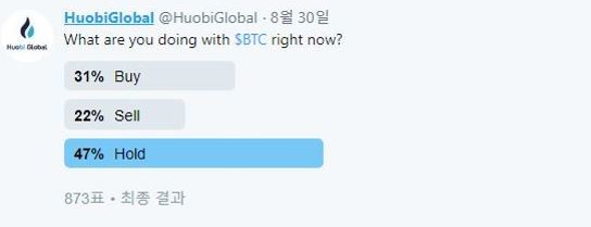 후오비 글로벌에 따르면 지난달 30일 공식 트위터를 통해 ‘현재 비트코인으로 무엇을 하고 있습니까?’라는 주제로 매도(Sell), 매수(Buy), 보유(Hold) 세 가지 선택지에 대한 설문조사를 진행했다. 총 873명이 참여한 이번 투표 결과 ‘보유’라고 답한 사람이 47%로 가장 많았고 ‘매수’라는 응답이 31%를 기록했다. ‘매도’라고 답한 사람은 전체 22%로 가장 낮은 비율을 보였다.