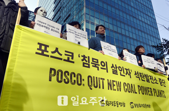 ▲ 환경운동연합, 포항환경운동연합 회원들이 서울 강남구 포스코센터 앞에서 '석탄화력발전소 추진 포스코 규탄' 기자회견을 하고 있는 모습. |