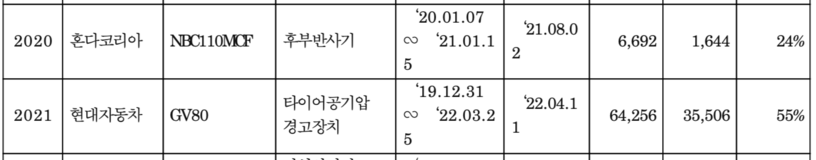 2022년 6월 기준 리콜 시정률이 50% 미만인 차량도 무려 7건에 달했으며, 그중에는 2480대 중 21대만 시정된 다빈월드의 HJ100T-7C의 시정률이 0.8%로 가장 낮았다. 혼다의 NBC110MCF(6692대)는 1644대만 시정이 이뤄져 시정률이 24%에 그쳤다.