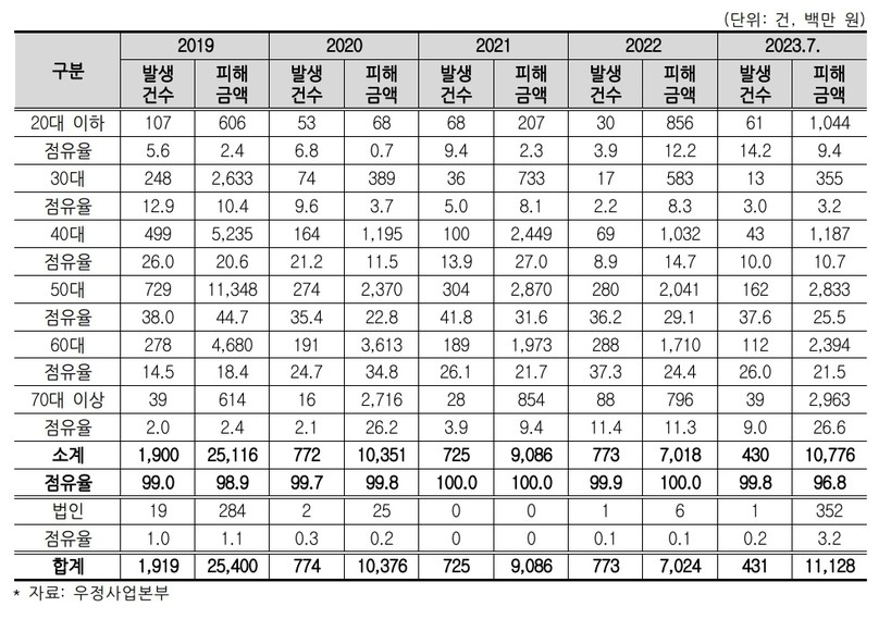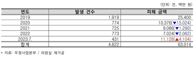 우체국 보이스피싱 피해액은 지난 2019년도에 254억 원에 달했다가 이후 2020년 103억 7600만 원을 기점으로 2021년과 2022년에도 각각 90억 8600만 원과 70억 2400만 원으로 점차 감세 추세를 보였으나 올해 피해액은 이미 전년도 보다 41억 400만 원가량 많다.