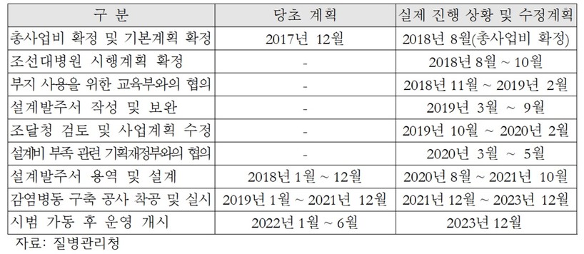 2020년 추경예산으로 편성된 2개 병원(충청권·경남권)은 설계업체와의 계약이 2020년 연내에 이루어지지 못해 2020년 제1회 추경예산 당시 편성된 45억3600만원은 전액 이월됐다.