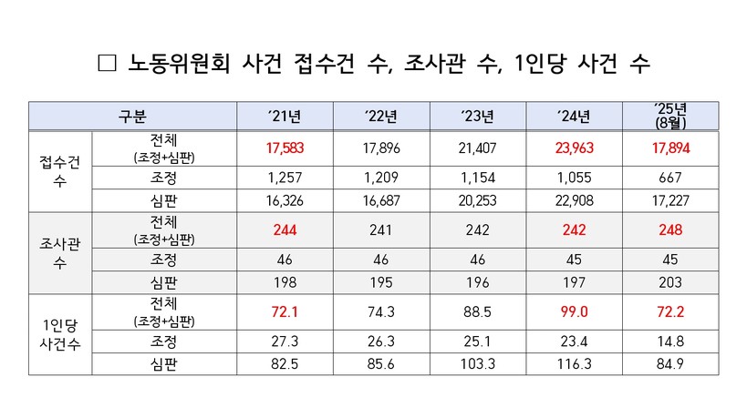 노동위원회에 접수되는 사건 수는 매년 꾸준히 증가하고 있다. 연도별 접수 건수는 2021년 17,583건, 2022년 17,896건, 2023년 21,407건, 2024년 23,963건이며, 2025년 8월 기준으로도 17,894건에 달한다. 반면 조사관 현원은 2021년 244명에서 2024년 242명으로 큰 변동이 없어, 조사관 1인당 사건 수가 빠르게 늘어나면서 업무 과부하가 심각한 수준에 이르렀다.