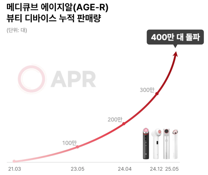 [일요주간 = 노현주 기자] 글로벌 뷰티 기업 에이피알(APR, 대표이사 김병훈)의 뷰티 디바이스 브랜드 ‘메디큐브 에이지알(AGE-R)’이 글로벌 누적 판매량 400만 대를 돌파하며, 뷰티 디바이스 시장에서 독보적인 성장세를 이어가고 있다.