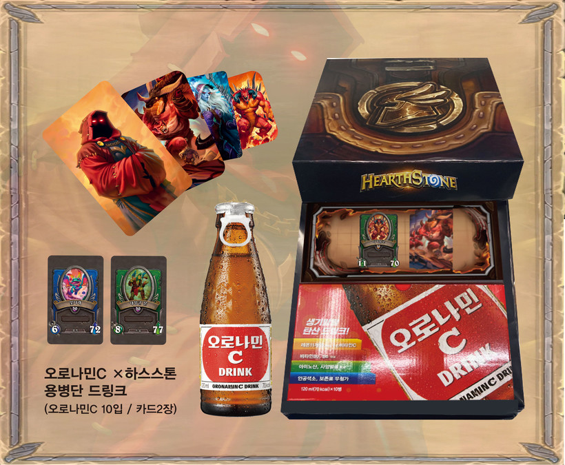 ‘오로나민C X 하스스톤 용병단 드링크’는 지난 10월 13일 하스스톤에 추가된 게임모드 ‘용병단’의 협업 상품으로, 오로나민C 1박스(10입)와 캐릭터 쿠폰팩 카드 1장, 용병 카드 1장으로 구성됐다.