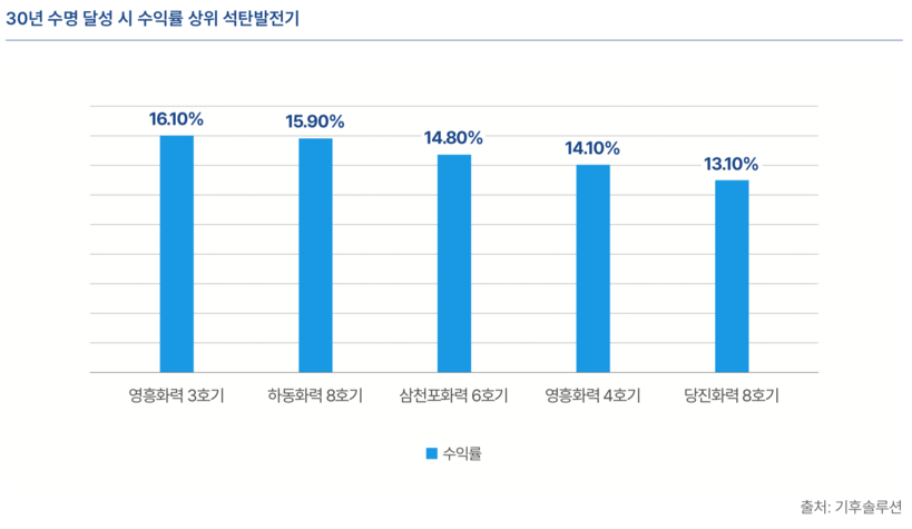 기후솔루션은 한전 발전자회사들이 보유한 석탄발전기의 수익률을 분석한 결과 지난해 기준으로 36기 발전기가 투자비와 이윤을 모두 회수했으며 누적 초과보상액이 27조 원에 달한다고 밝혔다.