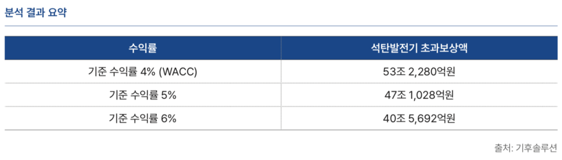 만약 이들 발전기를 계속 30년 동안 운영할 경우 초과보상액은 최대 53조 원에 이를 것으로 분석됐다. 기후솔루션은 “이미 충분히 보상받은 석탄발전기는 즉시 퇴출해도 재정적으로 문제가 없다”며 “이것이 2040 탈석탄 목표를 가장 빠르고 저비용으로 달성하는 길”이라고 제안했다.