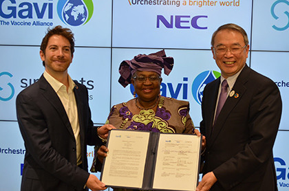 ▲ 사진 오른쪽에서 Nobuhiro Endo, NEC Corporation 이사회 의장, Ngozi Okonjo-Iweala, 이사회 의장, Gavi; Toprint Norman, Simprints Technology Ltd. 공동 창립자 겸 CEO.(NEC Corporation 제공) |
