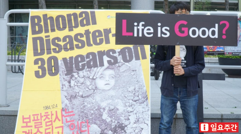 [일요주간 = 김성환 기자] LG화학 인도공장 스타이렌 가스유출 주민집단사망 참사 2주기를 맞아 인도에서 LG화학의 무책임에 항의하는 시위가 열렸다. 당시 가스유출사고로 현지주민 15명이 사망하고 600여명이 병원에 실려갔으며, 2만여명이 긴급대피했다.
