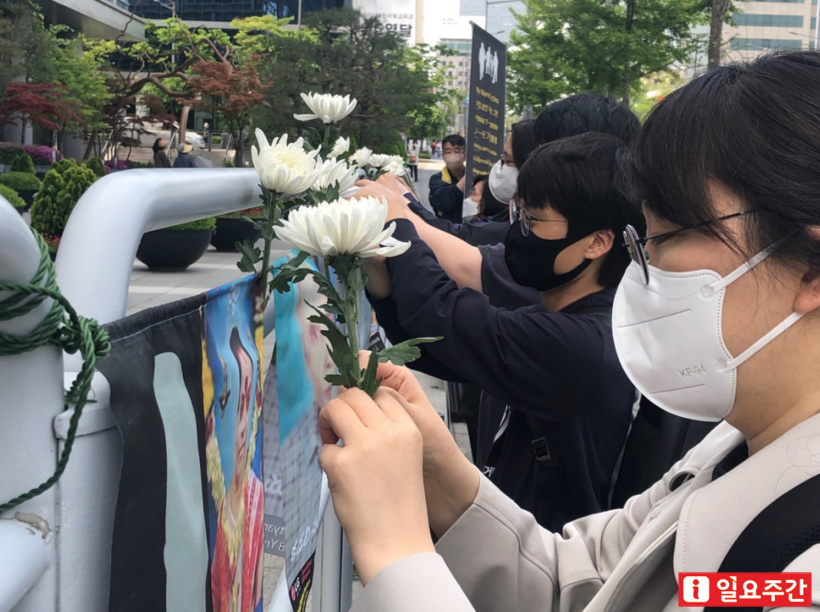 ▲LG 광화문빌딩앞에서 열린 LG화학 인도공장 주민사망참사 2주기 기자회견 참석자들이 인도 희생자의 사진에 추모의 의미를 담은 국화꽃을 달아주고 있다.