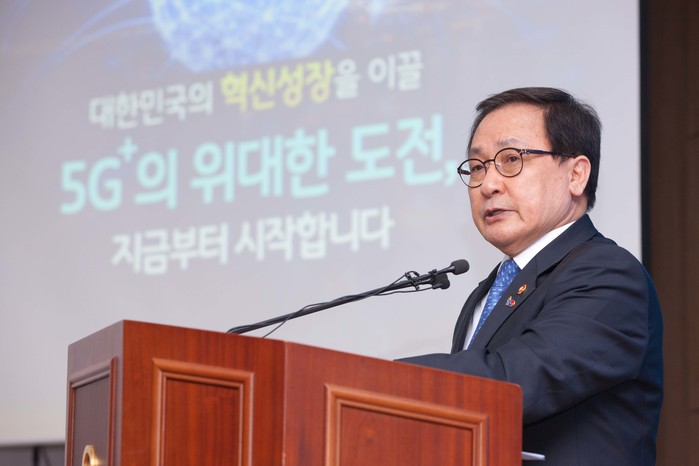 ▲ 유영민 과학기술정보통신부 장관이 지난 4월 8일 경기도 과천시 관문로 정부과천청사 과기정통부 기자실에서 '혁신성장 실현을 위한 5G+ 전략' 브리핑을 하고 있는 모습.(사진=과학기술정보통신부 제공) |