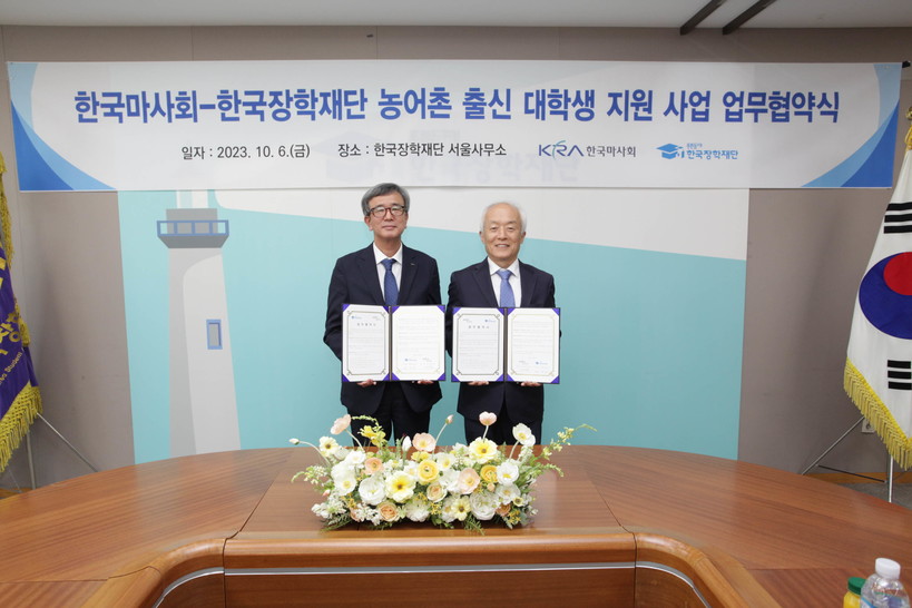 [일요주간 = 김성환 기자] 한국마사회(회장 정기환)와 한국장학재단(이사장 배병일)은 6일 농어촌 출신 대학생 등록금, 생활비, 주거비 등의 지원을 위한 업무협약(MOU)을 체결했다.
