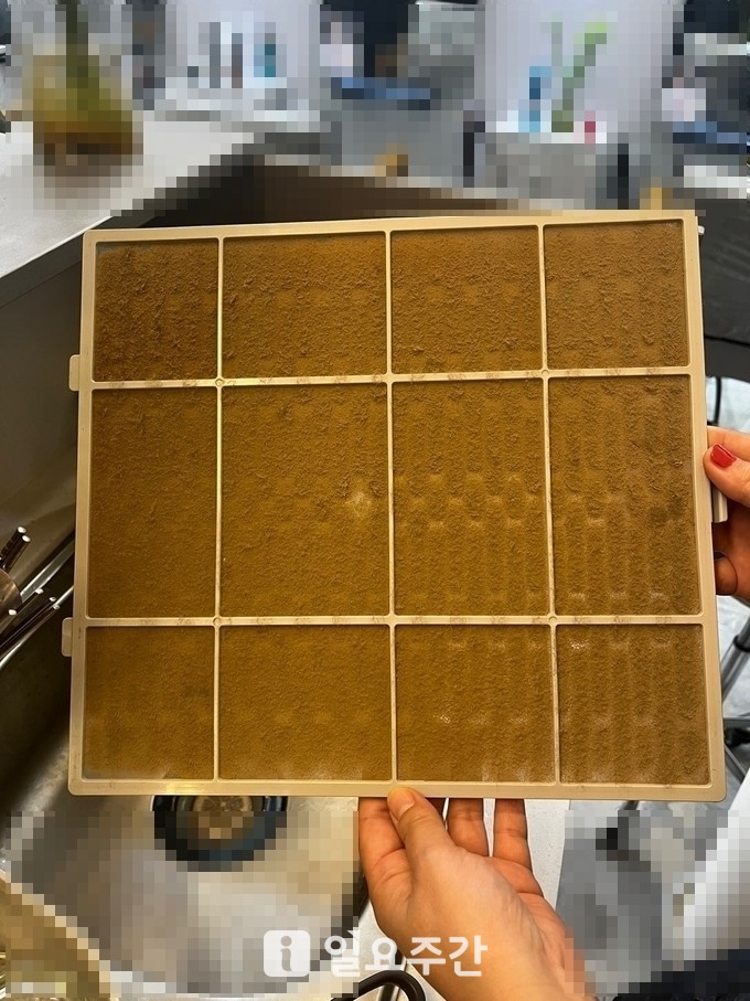 ▲건물 리모델링 공사 과정에서 나온 먼지로 인해 A 씨 매장 내에 설치된 공기청정기 필터에 먼지가 수북히 쌓여 있다. A 씨는 먼지에 비염까지 생겼다며 고통을 호소했다.(사진=제보자 제공) |