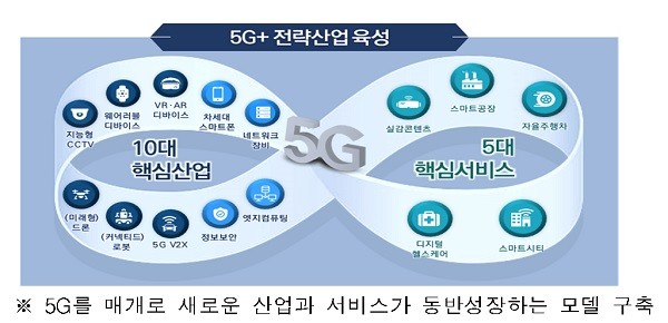 특히, 5G+ 전략산업을 선정하고 10대 핵심산업, 5대 핵심서비스에 대한 중점투자를 통해 5G 기반 신산업을 육성한다는 방침이다.