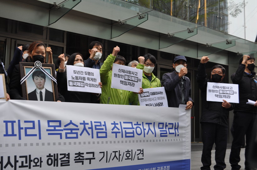| ▲지난 13일 서울 중구 페럼타워 앞에서 동국제강 공장 내 사망사고를 규탄하는 기자회견이 열렸다.(사진=성지온 기자) |
