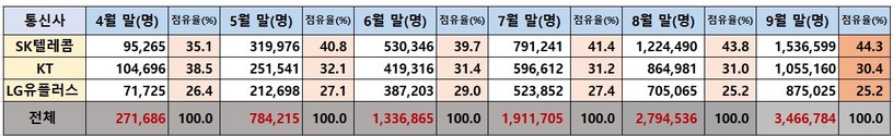 이동통신사별로는 SK텔레콤이 177만1485명(44.47%)로 가입자가 가장 많았다. 2위인 KT는 121만787명(30.4%)이고 LG유플러스 5G 가입자는 100만560명(25.12%)이다. 이동통신 3사는 지난 4월 세계 최초로 5G 상용화에 성공한 후 지난 5월부터 7월까지 매달 50만명대 수준으로 증가했다. 8월에는 삼성전자 ‘갤럭시노트10’ 출시에 힘입어 약 90만명 불었다. 이어 9월에도 70만명 가까이 확대되며 늘었다.