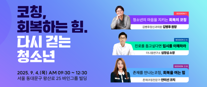 제3회 한국청소년코칭컨퍼런스는 ▲청소년의 마음 회복 코칭 ▲진로·입시 이해 ▲존재 중심 코칭 등 세 가지 세션으로 구성된다.