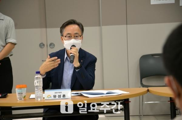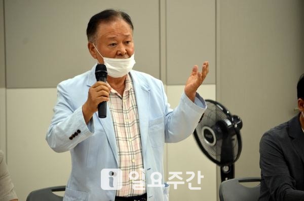 ▲8월 31일 이용복 G밸리산업협회장이 집중호우 피해와 관련해 대책마련을 요청하고 있다.(사진=조무정 기자)