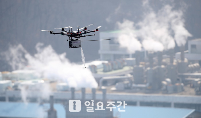 ▲ 환경부 국립환경과학원과 수도권대기환경청 미세먼지 감시팀이 오염물질 측정이 가능한 드론을 이용해 미세먼지 배출사업장 단속을 진행하고 있는 모습. |
