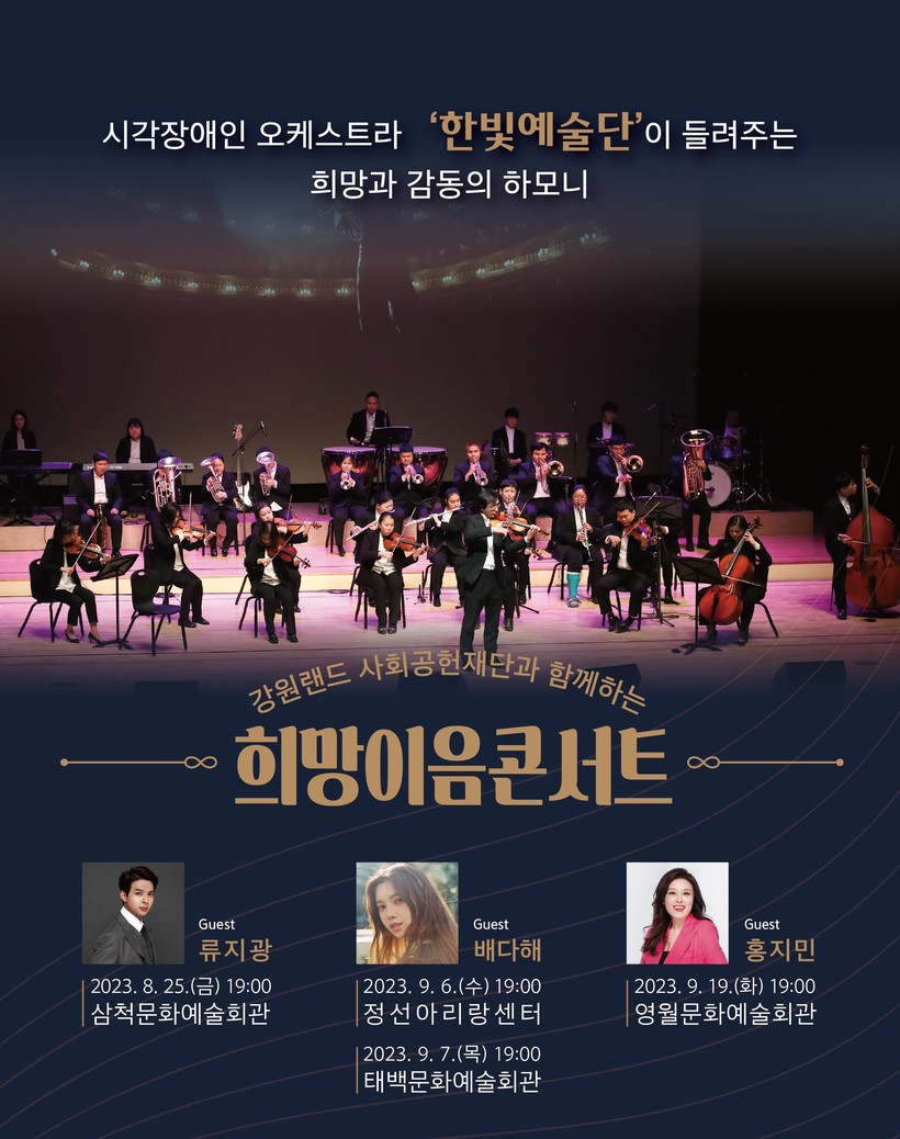 콘서트에는 수준 높은 연주력으로 감동과 희망을 전하는 시각장애인 오케스트라 ‘한빛예술단’이 출연하며, 가수 배다해가 정선과 태백 공연 게스트로, 뮤지컬배우 홍지민이 영월 공연 게스트로 출연한다.