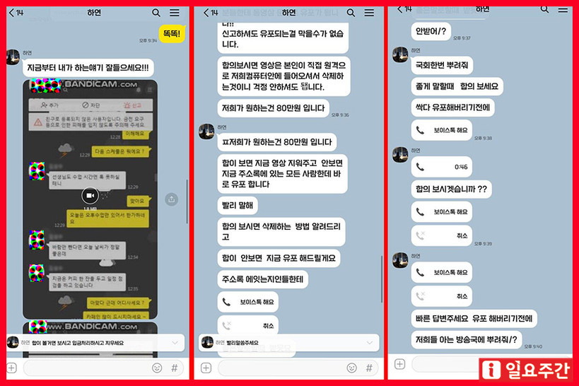 ▲ 제보된 실제 협박 카톡내용 (이미지편집=일요주간)