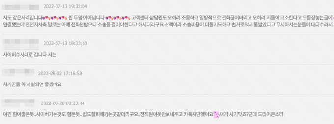또 다른 피해자는 “고객센터 상담원도 오히려 조롱하고 일방적으로 전화 끊어버리고 오히려 소비자에게 고소한다고 으름장 놓고 있다”며 “소액이라 소송비용이 더 들기도 하고 번거로워서 똥 밟았다고 무시하시는 분들이 대다수라서 그런 것 같은데 단체로 소송을 해야 할 것”이라고 목소리를 높였다.