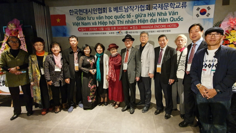 ▲ 지난해 10월 14일 부산 해운대 라마다앙코르호텔에서 열린 ‘한국현대시인협회&베트남작가협회 국제문학교류' 행사에 웅 웬 빙 프엉(왼쪽에서 네번째) 시인이 베트남작가협회 소속 시인들과 함께 베트남측 교류단장 자격으로 참석하고 있다. |