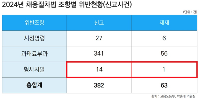 박 의원이 고용노동부로부터 제출받은 자료에 따르면 2024년 한 해 동안 채용절차법 위반 신고는 총 382건에 달했다. 이 가운데 과태료가 부과된 사례는 56건(14.66%), 시정명령은 6건(1.57%)에 그쳤고 형사처벌로 이어진 사례는 단 1건뿐이었다.